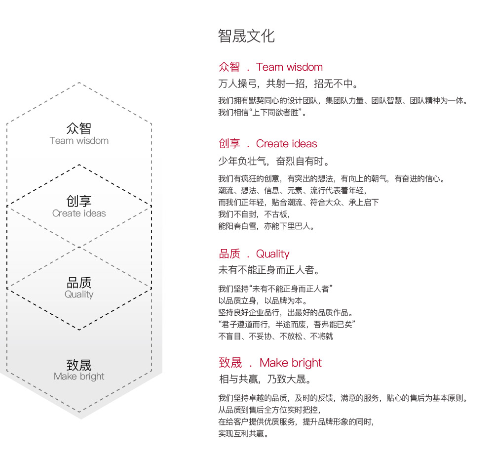 本著精益求精的原則,匯聚了一批各領域精英人才。智晟傳媒擁有一批來自美術學院畢業(yè)的資深設計精英,是一支經驗豐富、創(chuàng)意獨到、充滿活力、自信盡職、團結協(xié)作的創(chuàng)意執(zhí)行服務隊伍。負責的態(tài)度